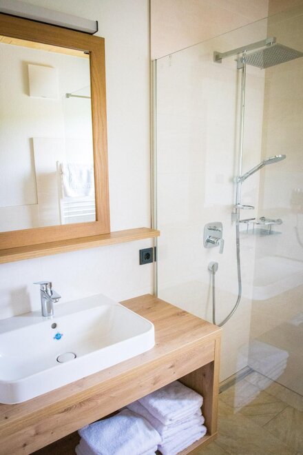 For your bathing comfort: a beautiful, large, feel-good bathroom with shower, towels, toilet paper, make-up mirror and hairdryer, separate toilet
