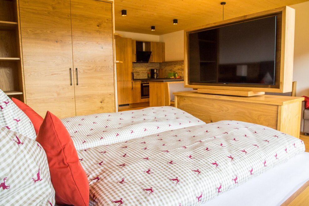 BERGROMANTIK, the 1-room apartment is a real wooden dream home with exposed roof truss, incomparable panoramic view of the Wildschönau mountains and its own south-facing balcony.