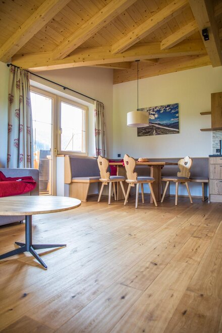For your living comfort: homely, cozy wooden roof trusses in the whole apartment, wooden floor with floor heating, wooden cloakroom, comfortable sofa (sofa bed for 1-2 people), with satellite TV, seating area with solid wooden table, south-facing balcony, WiFi