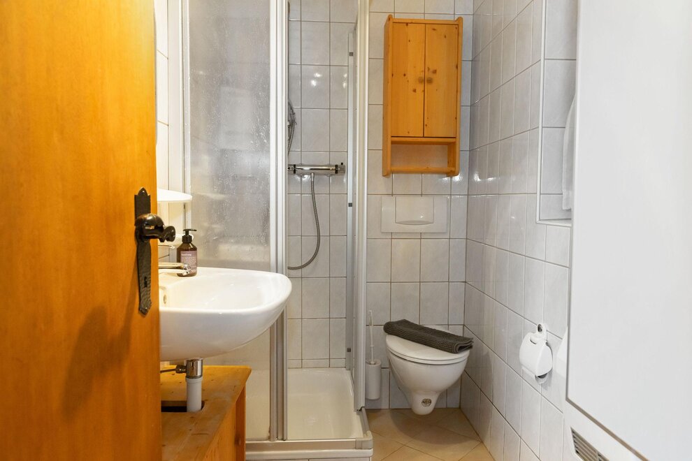 The accommodations Sonnenhütte UG and OG each measure 32 m2. Through a small hallway, you enter the bathroom (shower and toilet), and to the left, you reach the living area. Kitchen (cozy seating area, wood stove, fridge-freezer combo, drip coffee maker, kettle...)