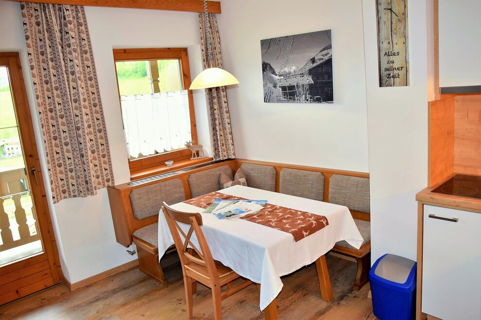 1 bathroom with shower 1 toilet 1 fully equipped kitchen (electric stove, oven, Coffee machine, dishwasher, refrigerator with freezer compartment) with seating area for 6 people and sofa bed for 2 people. (Dimensions: 160 x 180) 1 bedroom with double bed The apartment is modern and yet furnished in a cozy Tyrolean country house style and also has a real tiled stove.