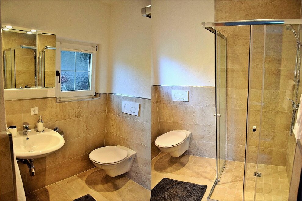 1 bathroom with shower 1 toilet 1 fully equipped kitchen (electric stove, oven, Coffee machine, dishwasher, refrigerator with freezer compartment) with seating area for 6 people and sofa bed for 2 people. (Dimensions: 160 x 180) 1 bedroom with double bed The apartment is modern and yet furnished in a cozy Tyrolean country house style and also has a real tiled stove.